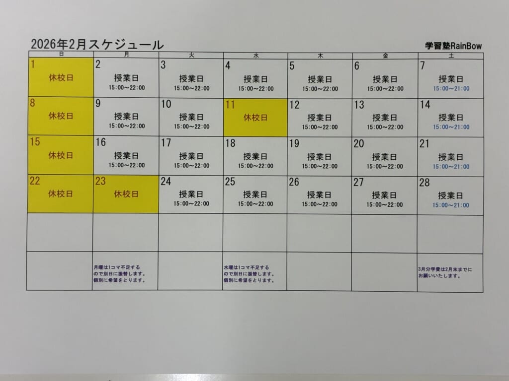 2月も学習塾RainBowをよろしくお願いいたします!