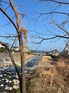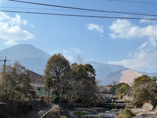 いつもの橋から境川や鶴見岳を眺めました!