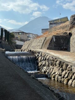 この川からも遠く鶴見岳を見ることができますね!