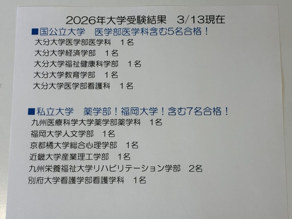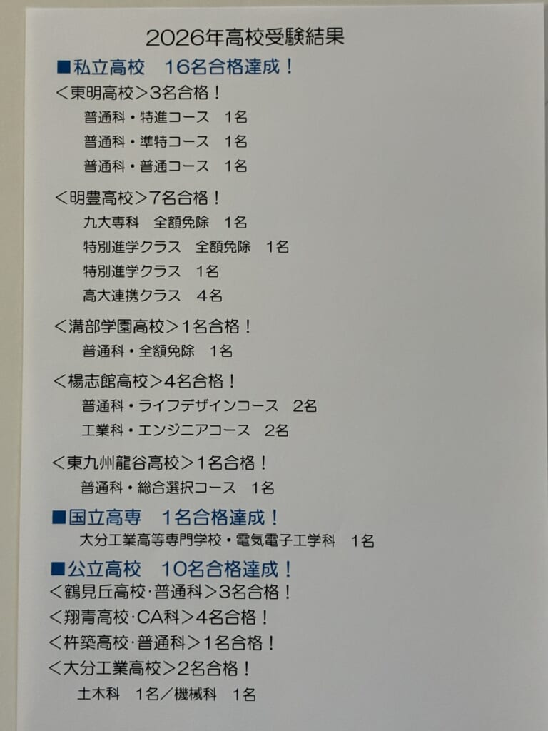 鶴見丘!杵築!大分工業!塾生全員合格!
