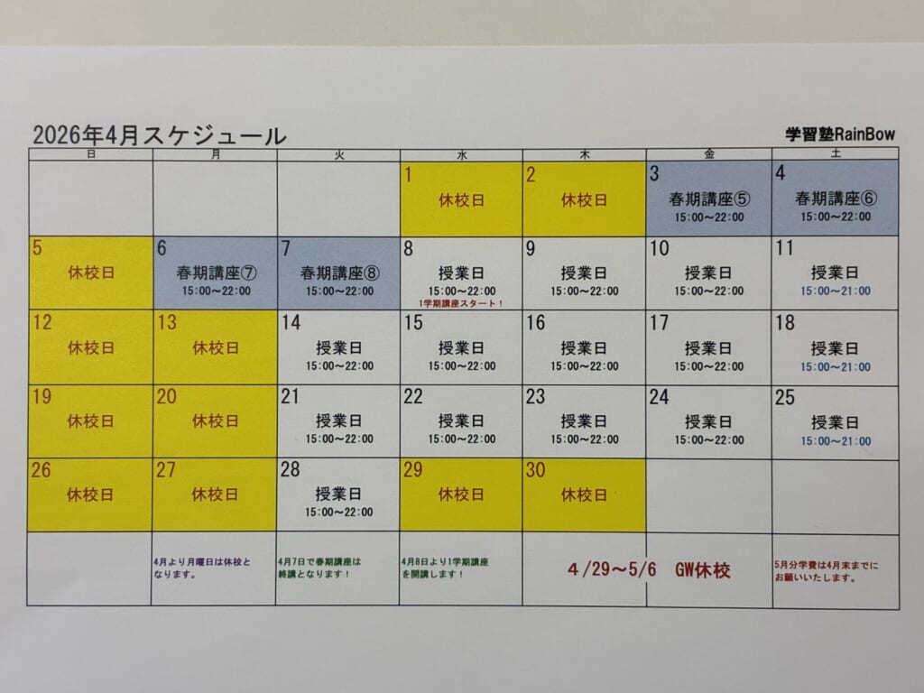 4月も学習塾RainBowをどうぞよろしくお願いいたします!