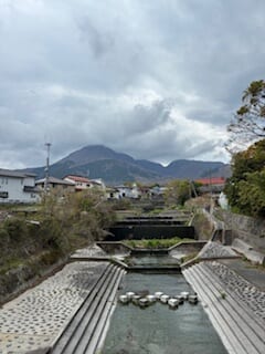 出会い橋から鶴見岳を眺める。